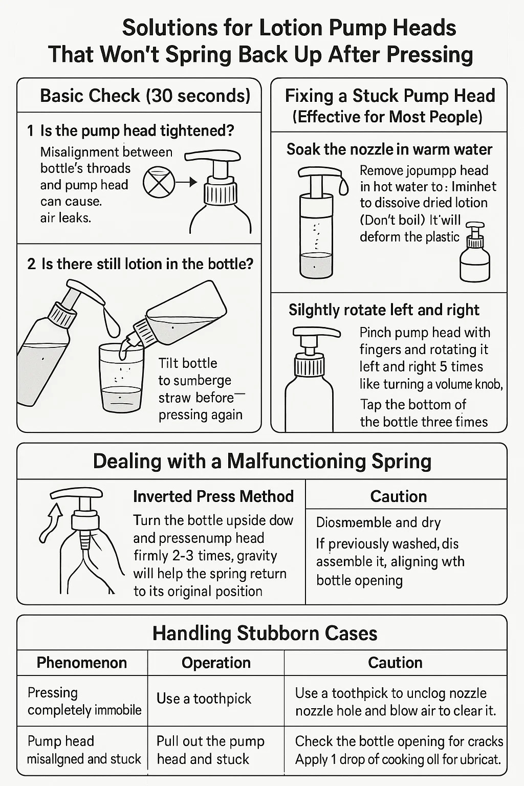 Mga solusyon para sa Lotion Pump Heads Hindi iyon magbabalik pagkatapos ng pagpindot: