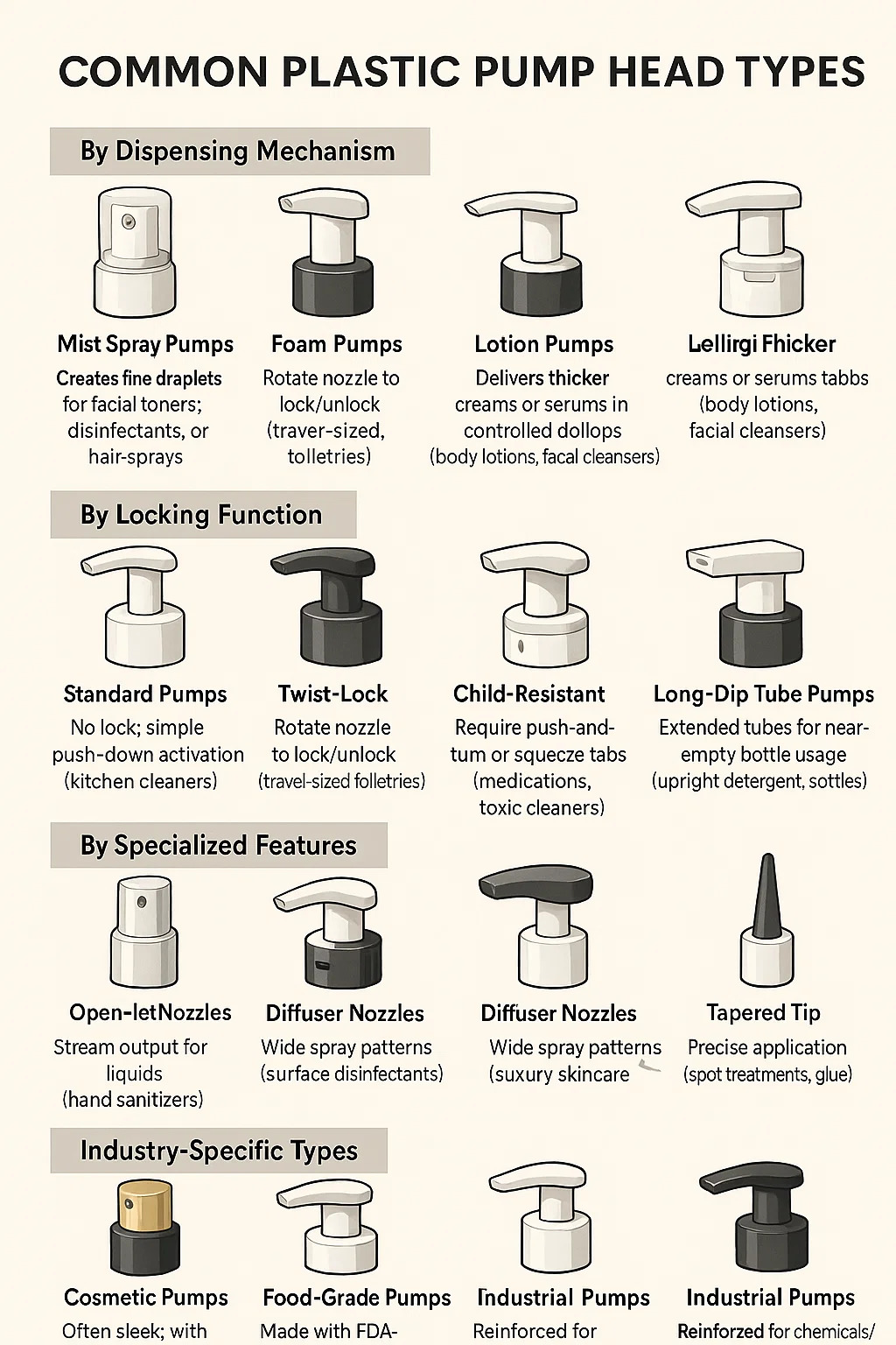 Narito ang isang pagkasira ng karaniwan Plastic Pump Head Mga uri batay sa kanilang mga disenyo at application: