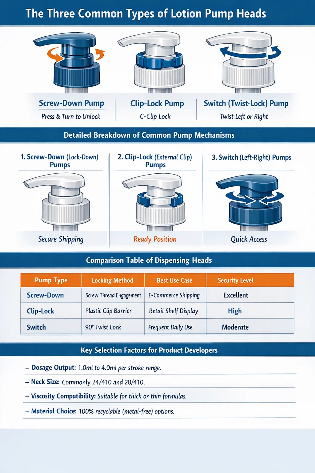 Sa industriya ng packaging, ang termino Ano ang tatlong karaniwang uri ng mga bomba? partikular na tumutukoy sa mga mekanismo ng pag-lock at dispensing na ginagamit upang ma-secure ang mga likido. Ang tatlong pinakakaraniwang uri ay Mga screw-down na pump, Clip-lock na pump, at Lumipat (Twist-lock) na mga pump . Ang bawat isa ay idinisenyo upang maiwasan ang pagtagas sa panahon ng pagbibiyahe habang nagbibigay ng partikular na karanasan ng user sa araw-araw na aplikasyon.