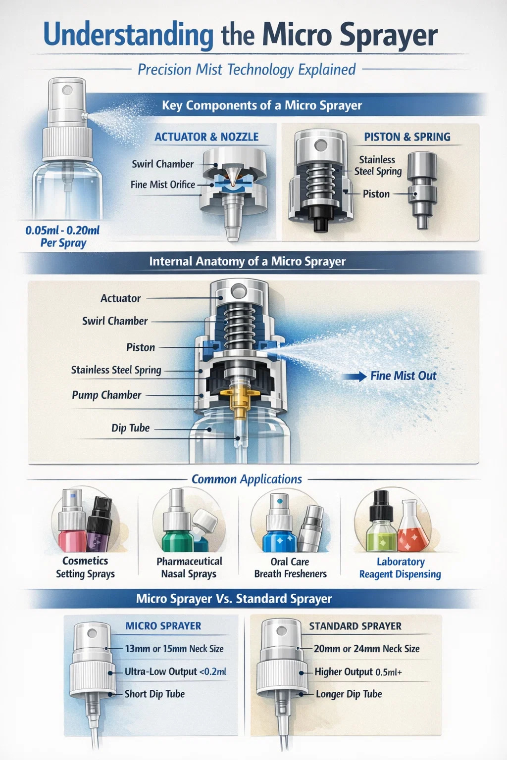 Para masagot ang tanong "Ano ang micro sprayer?" , ito ay isang precision-engineered na dispensing device na idinisenyo upang i-convert ang likido sa isang napakahusay, pare-parehong ambon na may napakababang dami ng output sa bawat stroke. Hindi tulad ng mga karaniwang trigger sprayer na ginagamit para sa paglilinis ng sambahayan, a micro sprayer karaniwang ibinibigay sa pagitan 0.05ml at 0.20ml ng produkto nang paisa-isa, ginagawa itong mainam na pagpipilian para sa mga likidong may mataas na halaga kung saan ang kontrol sa dosis at maselang paggamit ay pinakamahalaga.