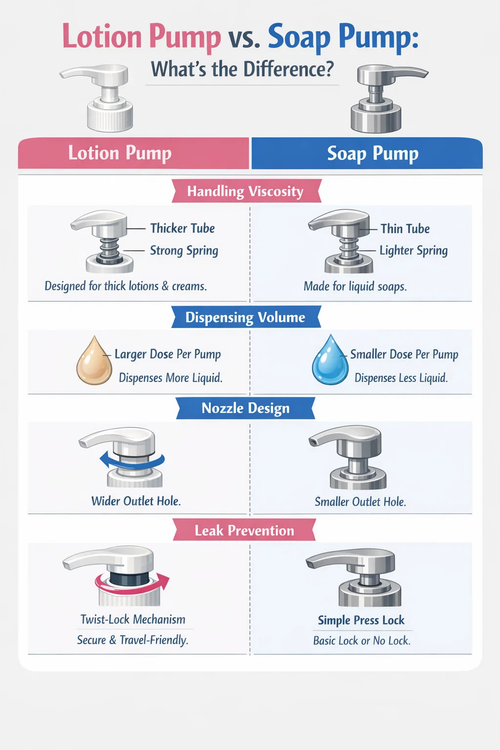 Soap Pump: Ang target nito ay kadalasang sobrang likidong hand soap o dish soap. Kung maglalagay ka ng makapal na body lotion sa isang regular na soap pump, maaaring mahirapan kang pindutin, o baka hindi ito bumangon nang maayos.