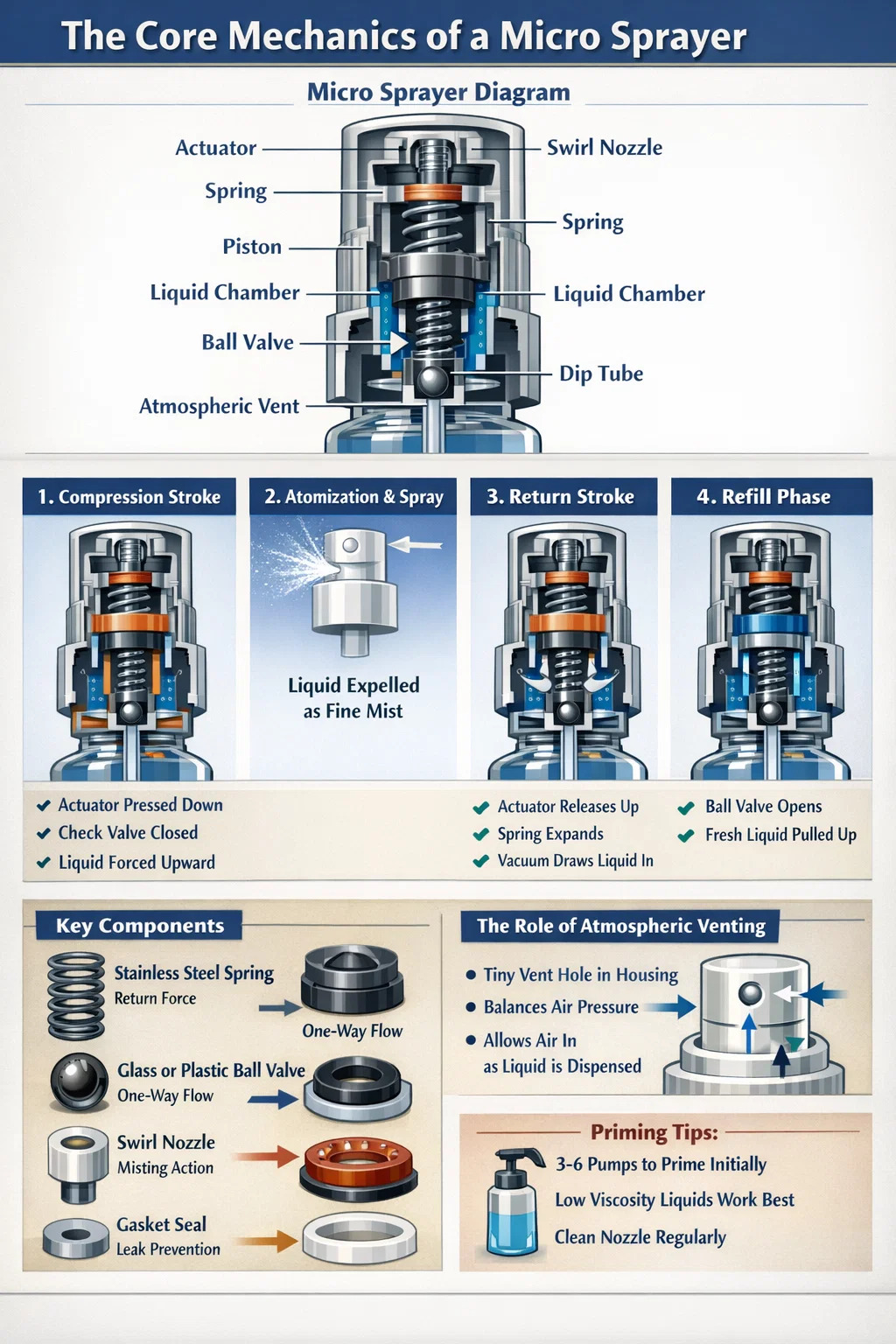 Ang pangunahing prinsipyo ng pagtatrabaho ng isang micro sprayer ay batay sa displacement ng likido at atmospheric pressure, partikular na gumagamit ng a positibong displacement pump na mekanismo . Kapag ang actuator ay nalulumbay, pinipiga nito ang isang spring at binabawasan ang volume sa loob ng isang maliit na silid, na pinipilit ang likido na lumabas sa pamamagitan ng isang precision nozzle. Sa paglabas, hinihila ng spring ang piston pabalik, na lumilikha ng a vacuum na kumukuha ng sariwang likido mula sa bote sa pamamagitan ng dip tube upang punan muli ang silid para sa susunod na spray.